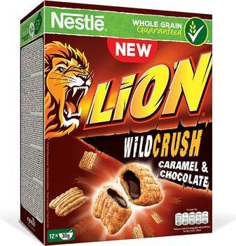 Зърн. Закуска LION CRUSH 360гр / Съставки: зърнени култури 49.2% (пълнозърнеста пшеница 28.0% (съдържа глутен), оризово брашно 17.7%, царевичен грис 3.5%), пълнеж с вкус на карамел и шоколад 35.8% (слънчогледово масло, пшеничено нишесте (съдържа глутен), шоколад 5.6% (нискомаслено какао на прах 2.9%, захар, какаово масло 0.7%), захар, обезмаслено мляко на прах 3.9%, карамел на прах 2.3% (суроватка на прах 0.7% (от мляко), краве масло (от мляко), малтодекстрин, захар, обезмаслено мляко на прах), минерал: калций, емулгатор: слънчогледов лецитин, ароматизанти, антиоксидант: (токофероли), захар, глюкозен сироп, витамини и минерали (калций, ниацин, желязо, пантотенова киселина, витамин В6, рибофлавин, фолиева киселина), сол, емулгатор: слънчогледов лецитин, слънчогледово масло, ароматизанти, сироп от карамелизирана захар, нискомаслено какао на прах, набухвател: натриев бикарбонат, оцветител: каротен, антиоксидант: токофероли. Шоколадът съдържа мин. 35% какаова маса. Може да съдържа фъстъци и други ядки. Хранителна стойност за 100 г продукт: Енергийна стойност: 1748kJ /425 kcal; Мазнини:14.2 г, от които наситени мастни киселини 2.8г; Въглехидрати: 63.9г, от които захари: 24.5г; Белтъци:7.4 г; Сол: 0.58 гТемпературно съхрание: Съхранение на сухо и хладно място. Да не се излага на пряка слънчева светлина и висока температура.Производител/ Дистрибутор :"НЕСТЛЕ БЪЛГАРИЯ" АД